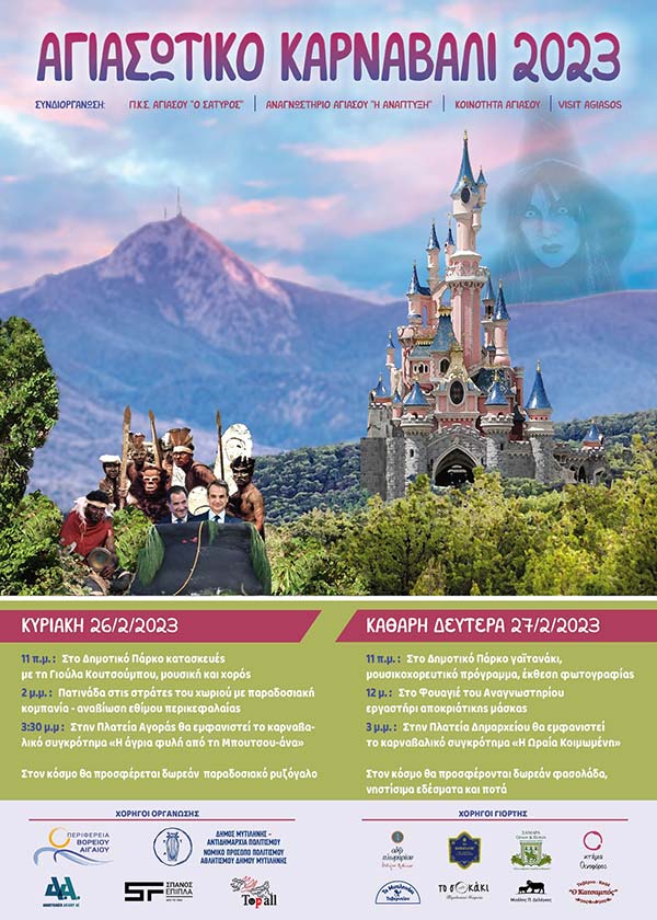 Πλούσιο είναι το πρόγραμμα των φετινών εκδηλώσεων της Αγιασώτικης Αποκριάς, που συνδιοργανώνονται από τον Πολιτιστικό Καρναβαλικό Σύλλογο Αγιάσου «Ο Σάτυρος», το Αναγνωστήριο Αγιάσου «Η Ανάπτυξη», την Κοινότητα Αγιάσου και την ΑΜΚΕ Visit Agiasos, με την οικονομική ενίσχυση της Περιφέρειας Βορείου Αιγαίου και του Δήμου Μυτιλήνης.