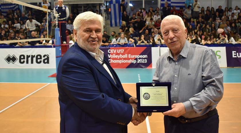 Ο Περιφερειάρχης Βορείου Αιγαίου Κωνσταντίνος Μουτζούρης συνοδευόμενος από τον Αντιπεριφερειάρχη Αθλητισμού Δημήτρη Κουρσουμπά, παραβρέθηκε την Κυριακή 23.04.2023 στο Κλειστό Γυμναστήριο της Νεάπολης όπου και βραβεύτηκε από τον Πρόεδρο της Ελληνικής Ομοσπονδίας Βόλεϊ Γιώργο Καραμπέτσο, στο πλαίσιο του αγώνα Ελλάδας – Τσεχίας.
