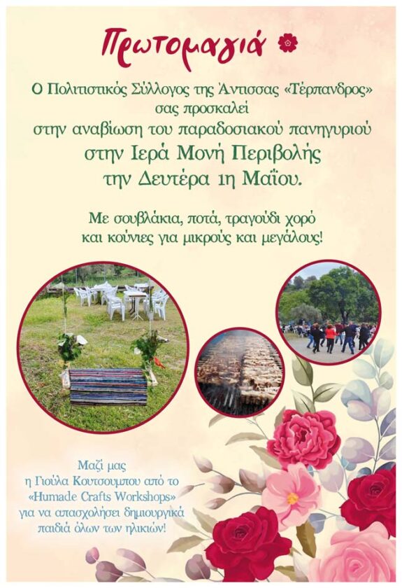 Ο πολιτιστικός Σύλλογος της Άντισσας Τέρπανδρος σας προσκαλεί στην αναβίωση του παραδοσιακού πανηγυριού στην Ιερά Μονή Περιβολής την Δευτέρα 1η Μαΐου 2023.