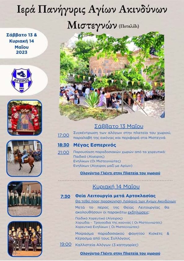 Ιερά Πανήγυρις με πλήθος εκδηλώσεων το Σάββατο 13 και την Κυριακή 14 Μαΐου στο εκκλησάκι των Αγίων Ακινδύνων Μιστεγνών στο Πεταλίδι.