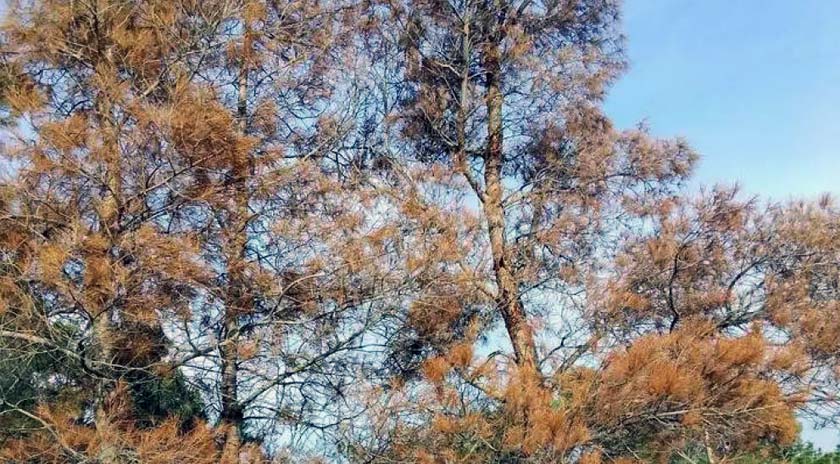 Οι συστάδες άρχισαν να παίρνουν ένα κοκκινωπό χρώμα και τα πεύκα στη συνέχεια κατέληγαν σε αποξηραμένους κορμούς.