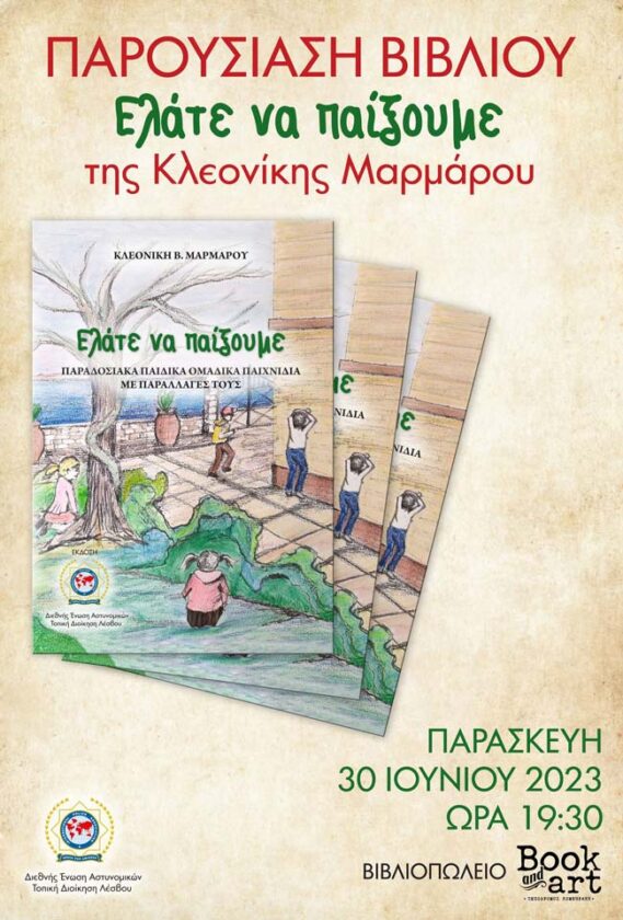 Μετά από μία σημαντική προσπάθεια, που ξεκίνησε πριν ένα χρόνο, από το προηγούμενο Διοικητικό Συμβούλιο της Τοπικής Διοίκησης Λέσβου/IPA και ολοκληρώθηκε από το υφιστάμενο, είμαστε στην ευχάριστη θέση να σας προσκαλέσουμε στην παρουσίαση ενός ξεχωριστού βιβλίου με λαογραφικό – παιδαγωγικό περιεχόμενο, που αφορά στην αναβίωση παλιών ομαδικών παιχνιδιών, το οποίο έχει εκδώσει η Τοπική μας Διοίκηση σε συνεργασία με τη συγγραφέα – φιλόλογο κυρία Κλεονίκη Μαρμάρου.