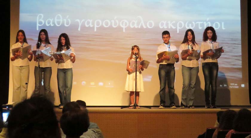 Την εκδήλωση ομόρφυνε με τραγούδια χορωδία παιδιών, η οποία και καλωσόρισε με έναν όμορφο και συγκινητικό λόγο τους συγγραφείς – μέλη της Ένωσης Λογοτεχνών Αιγαίου. Τη χορωδία των παιδιών αποτελούσαν: η Ταξιαρχούλα Αλατζά, η Θεανώ Γεωργέλλη, η Αθηνά Μάργαρη, ο Απόστολος Μάργαρης, η Σταυρούλα Μάργαρη, η Έλλη Μουστούκη και η Αθηνά Πετρίδου.
