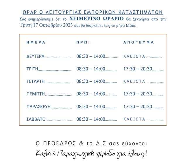 Σας ενημερώνουμε ότι το ΧΕΙΜΕΡΙΝΟ ΩΡΑΡΙΟ θα ξεκινήσει από την Τρίτη 17 Οκτωβρίου 2023 και θα διαρκέσει έως το μήνα Μάιο.