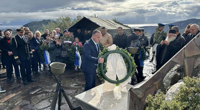 Μετά την Επίσημη Δοξολογία στο Μητροπολιτικό ναό «Αγίου Ιωάννου» στην Καλλονή, ακολούθησε η Άνοδος στο λόφο του «Τυρανιδίου» στη στήλη πεσόντων όπου και εψάλη Τρισάγιο χοροστατούντων του Μητροπολίτη Μυτιλήνης κ.κ. Ιακώβου και Μηθύμνης κ.κ. Χρυσοστόμου, το Προσκλητήριο πεσόντων και η τελετή κατάθεσης στεφάνων από τις αρχές.
