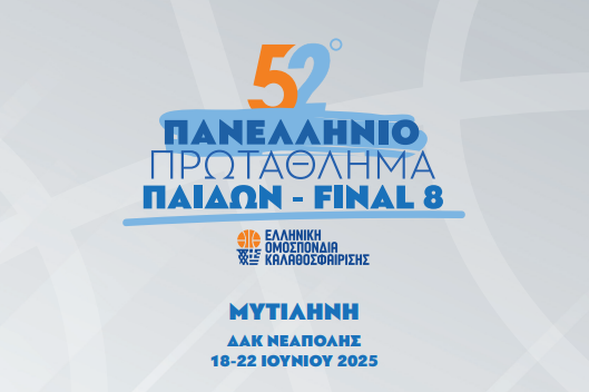 Στη Μυτιλήνη και ειδικότερα στο Δημοτικό Κλειστό Γυμναστήριο της Νεάπολης θα πραγματοποιηθεί από τις 18 έως και τις 22 Ιουνίου η τελική φάση (Final 8) του 52ου Πανελλήνιου Πρωταθλήματος Παίδων στο μπάσκετ, η οποία συνδιοργανώνεται από την Ελληνική Ομοσπονδία Καλαθοσφαίρισης, την Περιφέρεια Βορείου Αιγαίου και το Δήμο Μυτιλήνης.